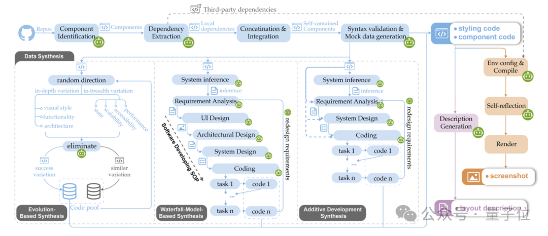 该⼯作流不仅能⾃动从公共代码库中提取真实数据,还能够⾃主合成数据,⽣成专业、多样化的前端代码。