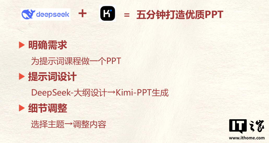 比如当我们想要制作 PPT 时,就可以使用 DeepSeek R1 完成大纲设计,最后再来通过 Kimi 生成。
