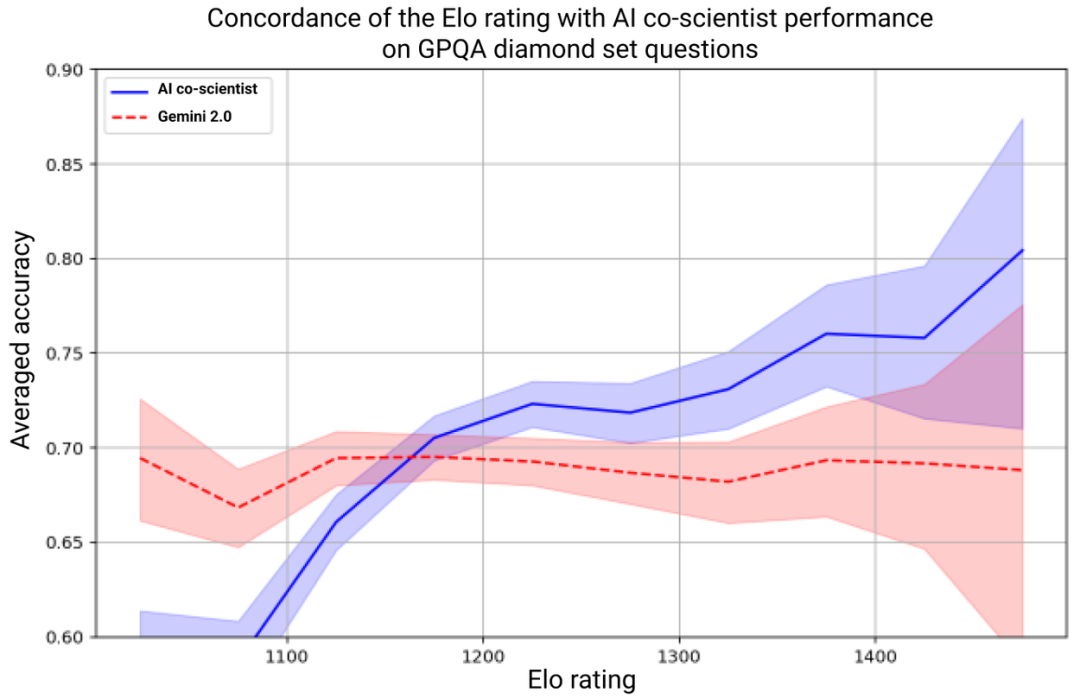 AI co-scientist(蓝色线)和 Gemini 2.0(红色线)的平均准确率对比,按 Elo 评级分组