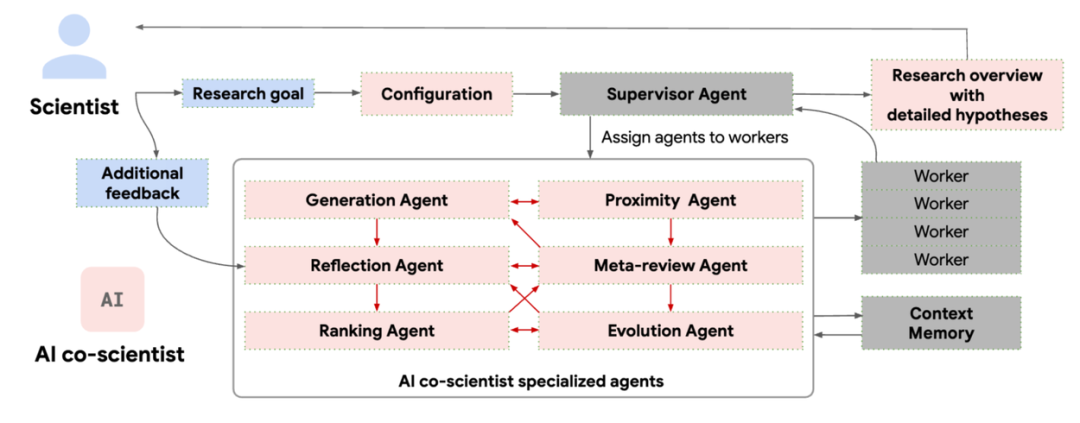 最近,谷歌、斯坦福大学等机构的研究人员开发了一个多智能体、基于 Gemini 2.0 的 AI 协同科研(AI co-scientist)系统,具备跨复杂主题的综合能力和进行长期规划、推理的能力,除了传统的文献综述、总结功能之外,还可以辅助科研人员提出新的、原创知识,或是基于先前的成果制定研究假设 (hypotheses) 和计划 (proposal)。