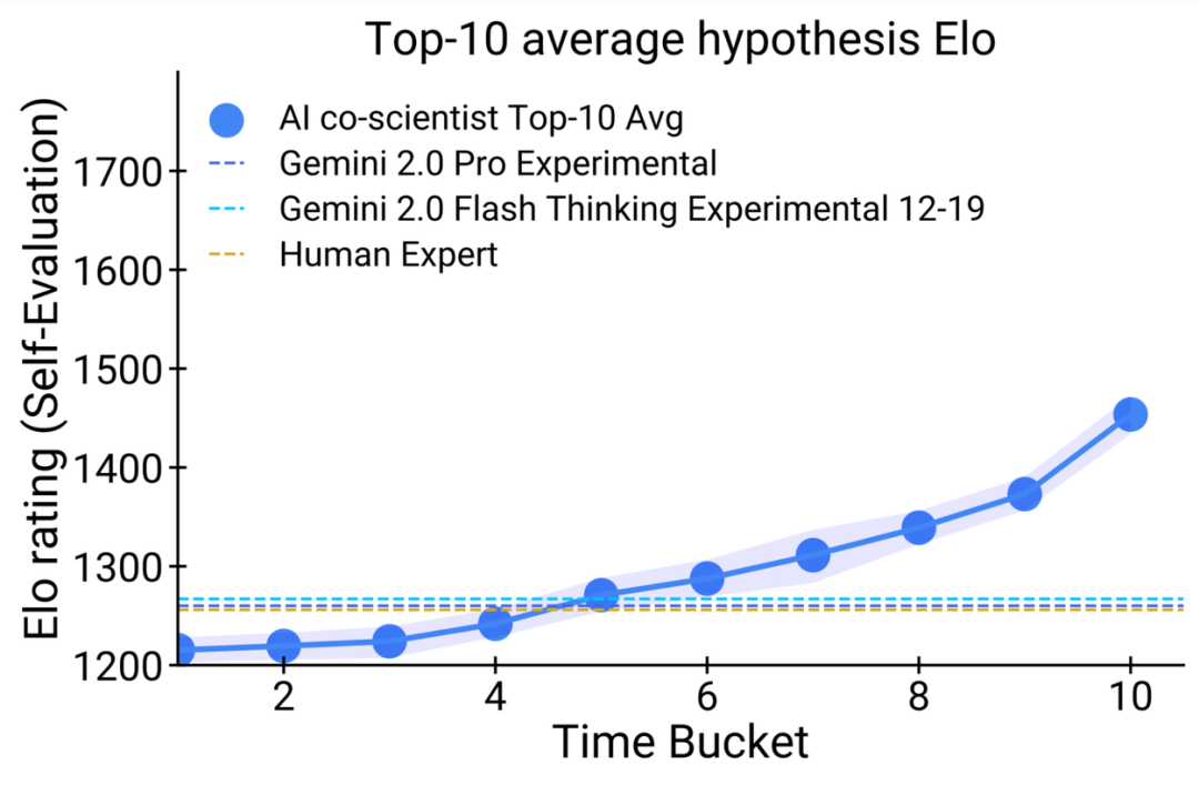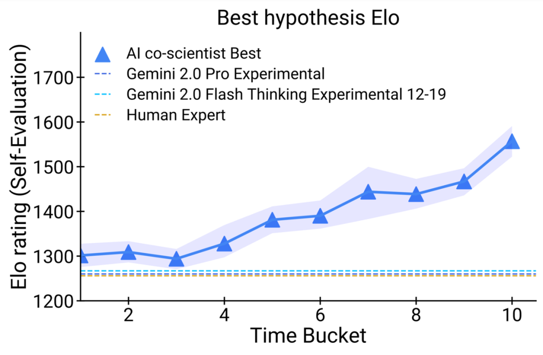AI co-scientist 使用「测试时计算」技术来迭代推理、进化和改进输出,如进行自我对弈(self-play)科学辩论以生成新假设,对所有假设进行质量排名对比,或是不断进化假设等,可以让智能体不断进行自我批评,使用工具进行反馈以细化假设和提案。