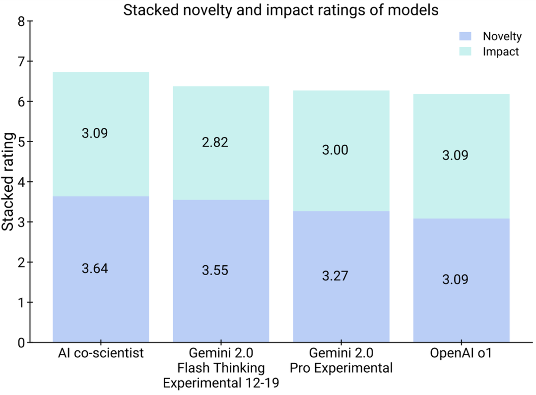在 11 个研究目标的小子集上,专家们评估了 AI co-scientist 生成结果相对于其他基线模型在新颖性(novelty)和影响潜力(impact)的总体偏好,虽然样本量较小,但专家们普遍认为 AI co-scientist 更受欢迎,与之前引入的 Elo 自动评估指标一致。