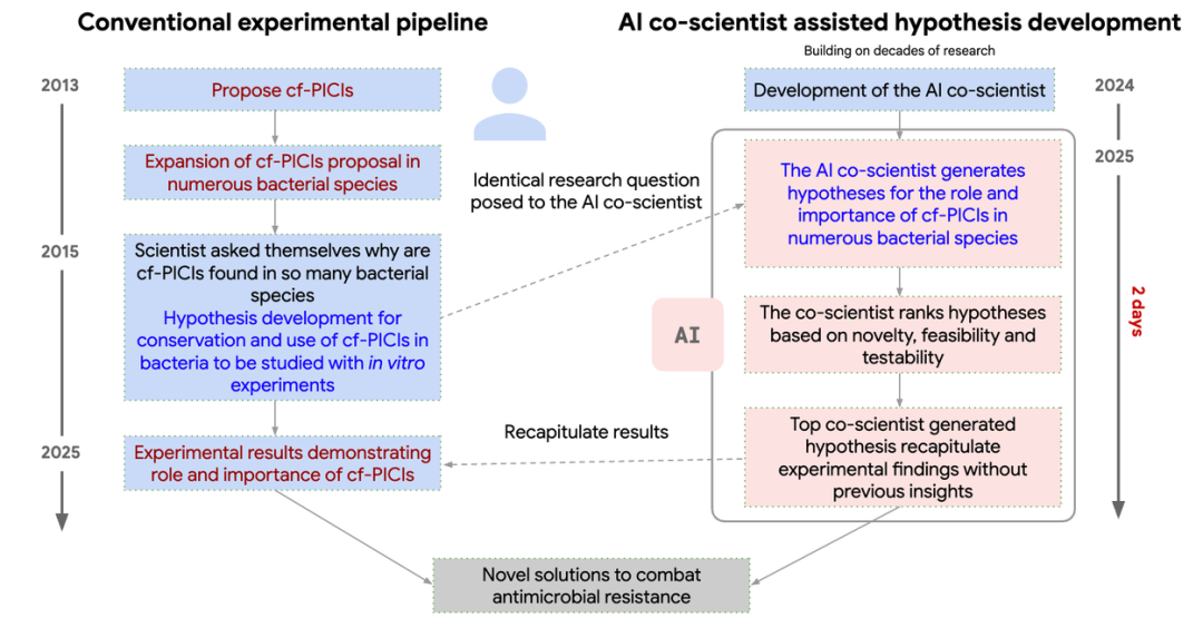 AI co-scientist 重新发现新型基因转移机制的时间线。蓝色:cf-PICI 发现实验研究流程时间线。红色:AI co-scientist 在没有先验知识的情况下发展和重现这些关键发现