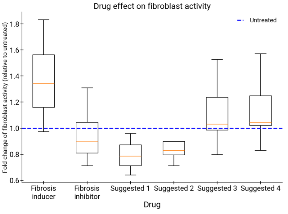 AI co-scientist 建议的治疗方案与纤维化诱导剂(阴性对照)和抑制剂(阳性对照)的治疗效果对比