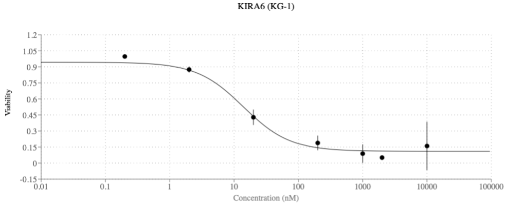 三种新型 AI 合科学家预测的 AML 再利用药物之一的有效剂量反应曲线;KIRA6 在临床相关浓度下抑制 KG-1(AML 细胞系)的存活,能够在较低药物浓度下降低癌细胞存活,减少了脱靶副作用的可能性