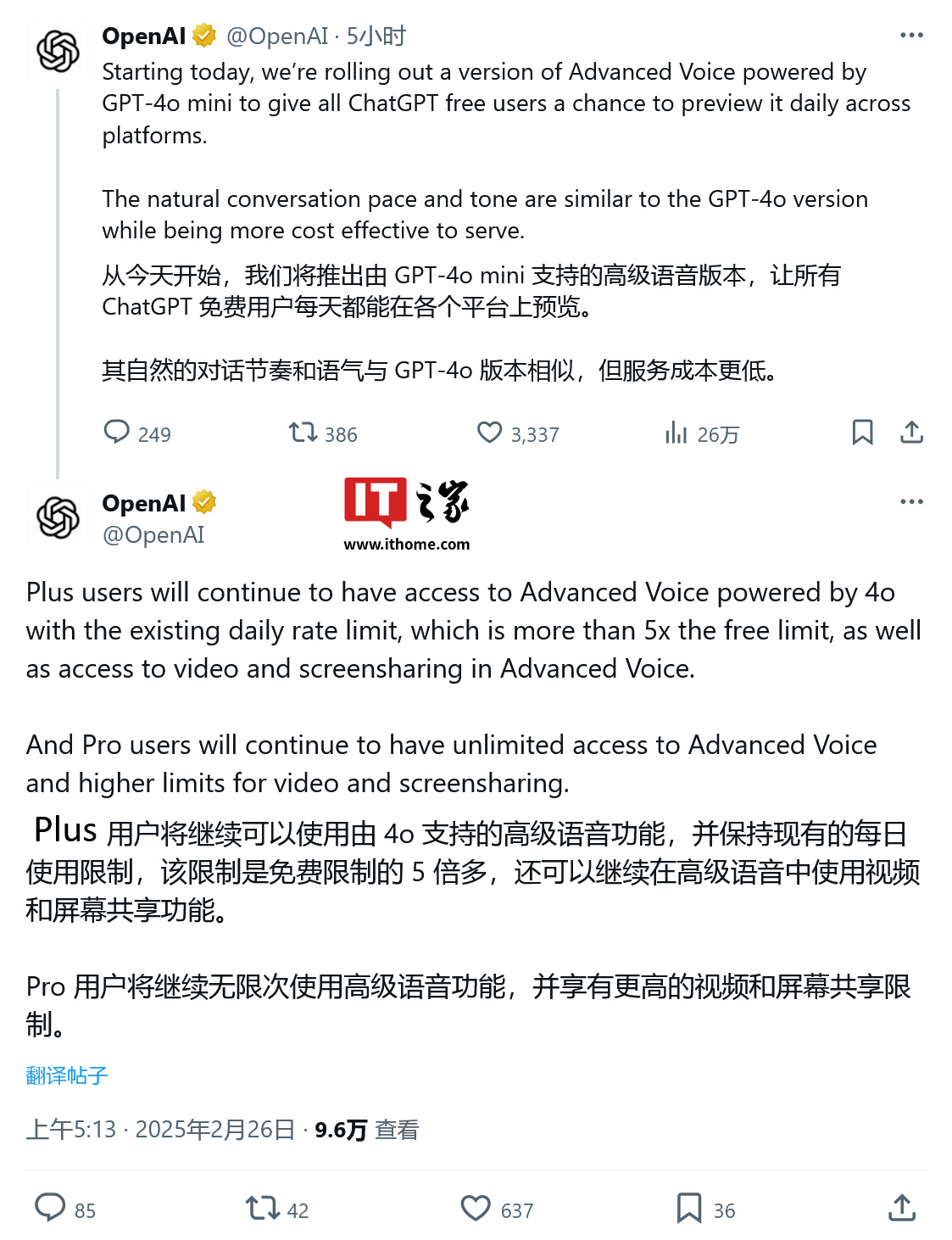 2 月 26 日消息,OpenAI 公司今天(2 月 26 日)在 X 平台发布推文,宣布免费开放 ChatGPT 高级语音模式(Advanced Voice Mode),让更多用户体验更自然的语音对话。